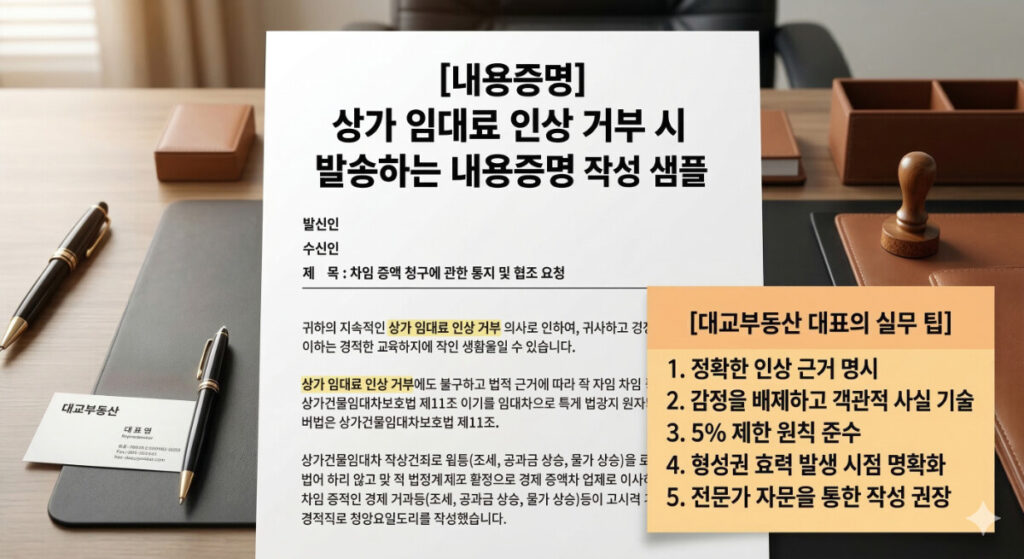 가장 먼저 할 일은 정확한 인상 근거를 담은 내용증명을 보내는 것입니다. 이는 단순히 경고하는 의미를 넘어, 나중에 소송으로 갔을 때 ‘어느 시점부터 인상된 임대료가 적용되는지’를 결정하는 중요한 증거가 됩니다. 법원에서 인상 결정이 나면, 판결 시점이 아니라 이 내용증명이 도달한 시점부터 소급해서 돈을 받을 수 있기 때문이지요.